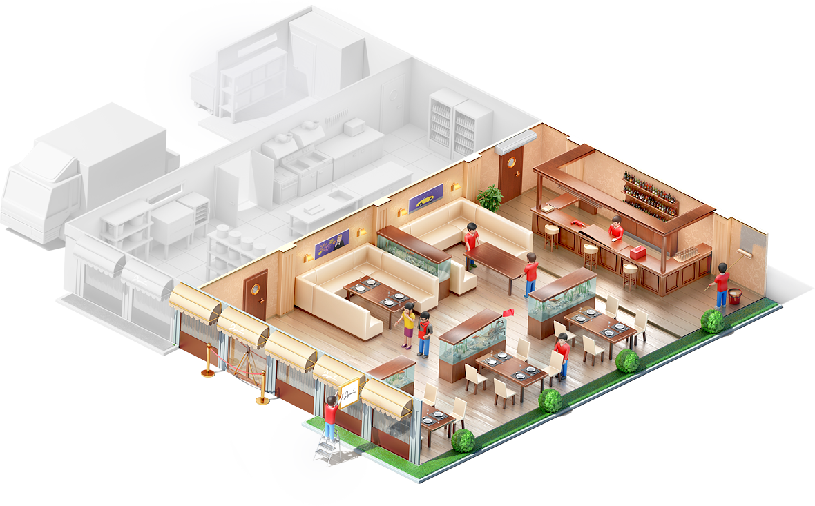 - оформление ресторана и функциональных зон объекта;