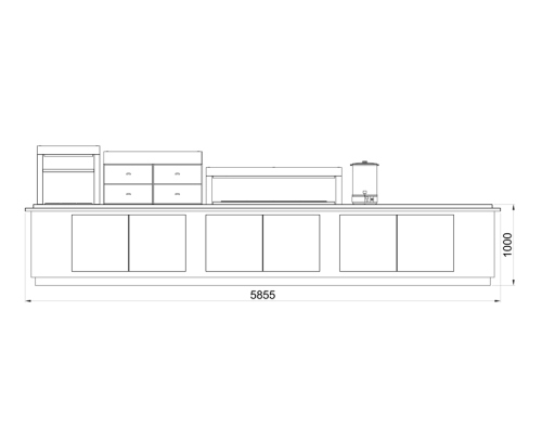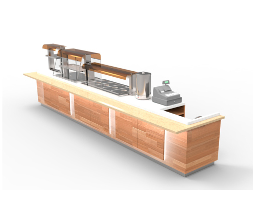 Основной материал столешницы — искусственный камень, прекрасно зарекомендовавший себя в десятках проектов. Его разновидность и расцветку также можно выбрать под интерьер своего заведения. Линия раздачи спроектирована с учетом требований современного заведения питания. Материалы просты в очистке и выдерживают высокие температуры.