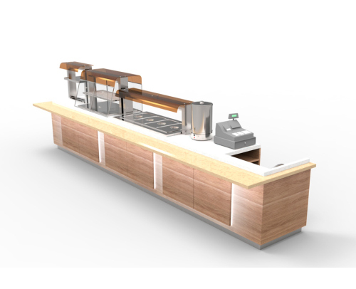 Индивидуальная линия раздачи объединяет в себе модули серии «Регата» и барную стойку из искусственного камня Antarrid Classic.