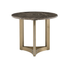 Круглая мраморная столешница с изысканным рисунком под керамику подчёркнута тёплым металлическим обрамлением в цвете шампань, создавая ощущение лёгкости и благородства.